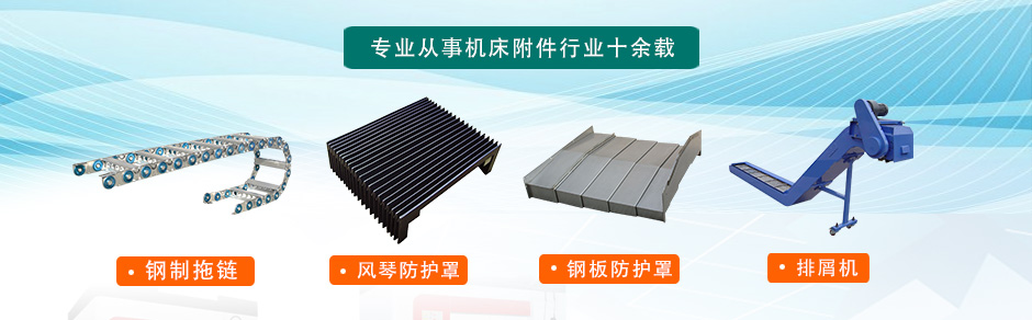 主要產(chǎn)品有:鋼板、不銹鋼板導(dǎo)軌防護罩、柔性風(fēng)琴式導(dǎo)軌防護罩、不銹鋼片盔甲防護罩、伸縮式絲杠防護罩、油缸氣缸保護套、螺旋鋼帶保護套、卷簾伸縮防護罩、鋁型材防護簾、排屑機、機床工作燈、機床墊鐵、可調(diào)塑料冷卻管、金屬冷卻管、機床導(dǎo)軌刮屑板、T型撞塊槽板、塑料法蘭蓋、鋼管護帽等產(chǎn)品。